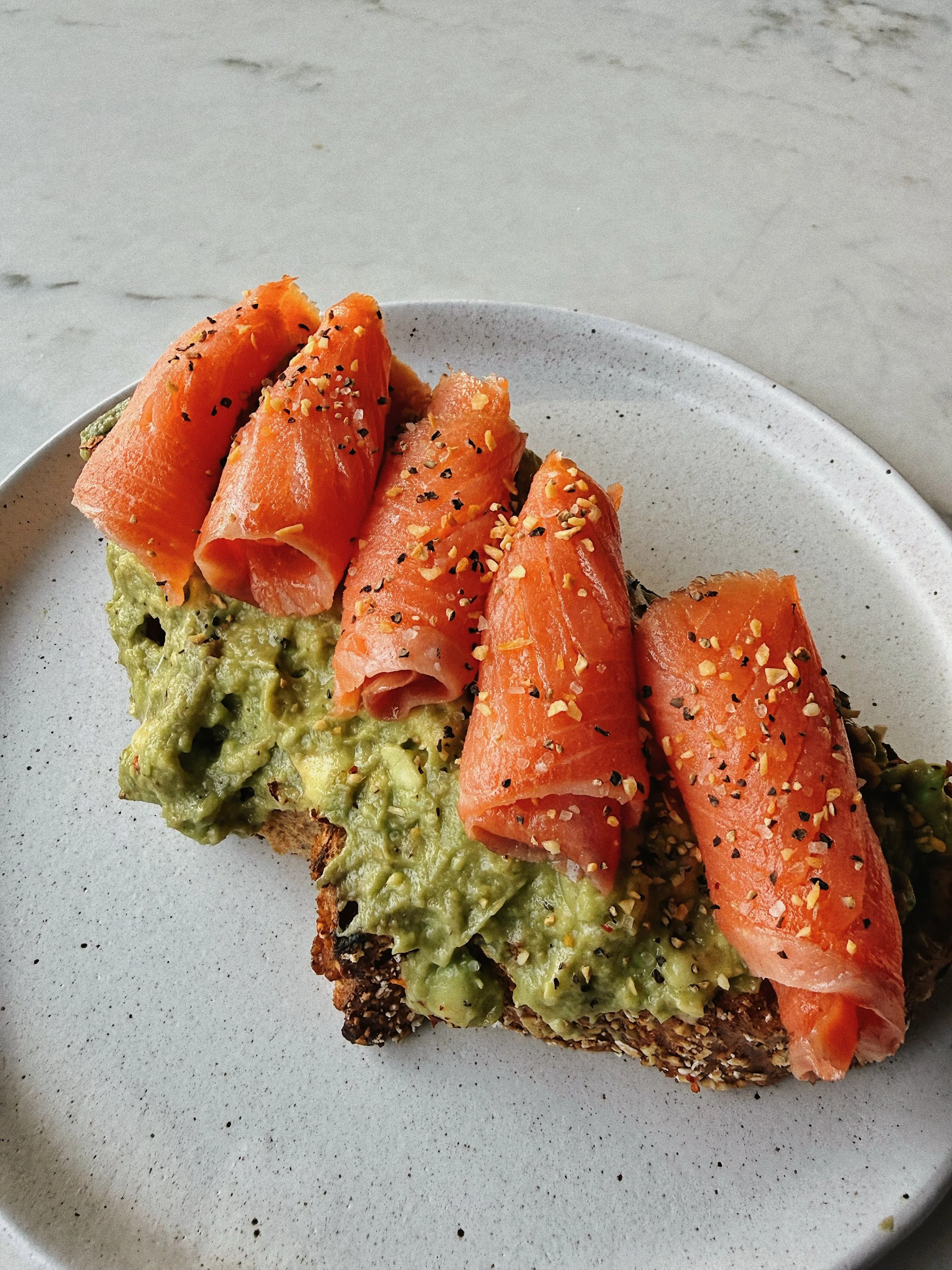 Our lox avocado toast layers creamy avocado and silky lox on toasted bread, finished with everything bagel seasoning for a perfectly balanced, savory bite.